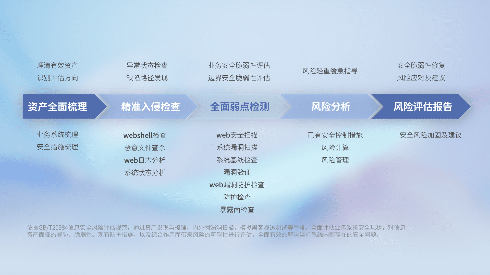 针对客户行业特性,,,以专业的安全服务+多厂商联合解决方案提供专属的一站式安全管理服务,,帮助客户全面感知网络空间威胁,,基于识别、、、、检测、、、分析、、防护、、、监测、、、响应的服务理论模型,,,,从方案咨询、、、、集成交付、、、、评估验证、、优化加固、、、运维运营,,,,致力于为客户提供完整的闭环管理式安全服务。。。以实战经验为客户打造高抵御风险的安全体系,,帮助客户发现威胁、、、、对抗威胁、、、处置威胁,,,不断积累安全对抗能力,,持续保障数字化安全。。。